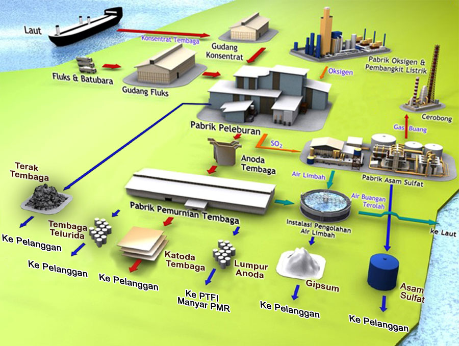 Proses Mitsubishi pada tahap peleburan dan Proses ISA pada tahap pemurnian digunakan sebagai proses utama yang digunakan di Pabrik Peleburan dan Pemurnian Tembaga Gresik. Proses Lurgi-Mitsubishi kontak ganda dan penyerapan ganda digunakan untuk mengolah gas buang dari Pabrik Peleburan. Pengolahan air dengan beberapa tahap proses, juga dibangun untuk memproses semua limbah cair dari pabrik. Alur proses Pabrik Peleburan dan Pemurnian Gresik secara umum ditampilkan di diagram sederhana PT Smelting.