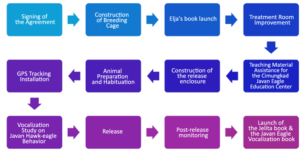 To this end, PT Smelting has undertaken sustainable conservation efforts, from breeding to the release of young Javan Hawk-eagles into the wild. By 2024, this program will have added eight individuals to the total Javan Hawk-eagle population. One young Javan Hawk-eagle from the breeding program was released into the wild in early 2023. Jelita, the eagle's name, was also equipped with a GPS collar for post-release monitoring. This was the first of its kind in the world. In addition to conservation efforts, research on sound (bioacoustics) and behavior has been conducted and published in scientific journals and books. Javan hawk-eagle awareness campaigns are also frequently held to encourage public participation in protecting the Javan hawk-eagle's habitat. To facilitate the dissemination of information and education on Javan hawk-eagle conservation, the company published Elja, a children's storybook, in 2023. The other two books are Jelita (2024) and Studi Vokalisasi (2025).
