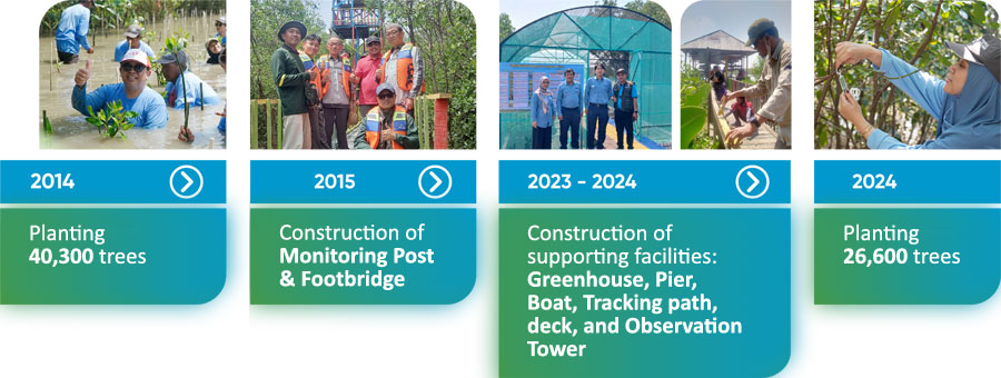 To improve ecosystems, particularly coastal ecosystems, PT Smelting has implemented a mangrove conservation program since 2014 by planting 5 hectares of mangroves in the Leweyan River delta, a tributary of the Bengawan Solo River, in Pangkah Kulon Village, Gresik. The mangrove area in Ujung Pangkah serves as a transit point for migratory birds from Australia during their wintering in their native habitat. The upper and lower parts of mangrove trees store carbon in the form of biomass, which is useful for mitigating climate change and the impacts of global warming. Furthermore, mangrove forests can also help achieve several targets in the Sustainable Development Goals (SDGs). Some of the mangrove species planted include Avicennia marina, Rhizophora mucronata, Rhizopora bruguera, and Rhizophora apicula, with an average tree height of 3 meters. To monitor mangrove development, PT Smelting has also established a monitoring post.