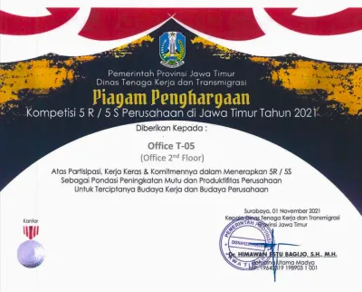 2021 PT Smelting mendapat penghargaan 1 emas,1 perak, 2 perunggu dalam Kompetisi 5S se-Jawa Timur dari Pemerintah Prov. Jawa Timur.