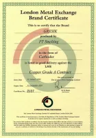 Katoda tembaga terdaftar di LME (London Metal Exchange) kategori A pada bulan Juli 2001. Catatan : Sejak 2004, LME mengumumkan penghentian penerbitan sertifikat merk dan sebagai pengganti digunakan publikasi daftar merk yang terdaftar dalam LMW yang dapat diakses melalui situs.